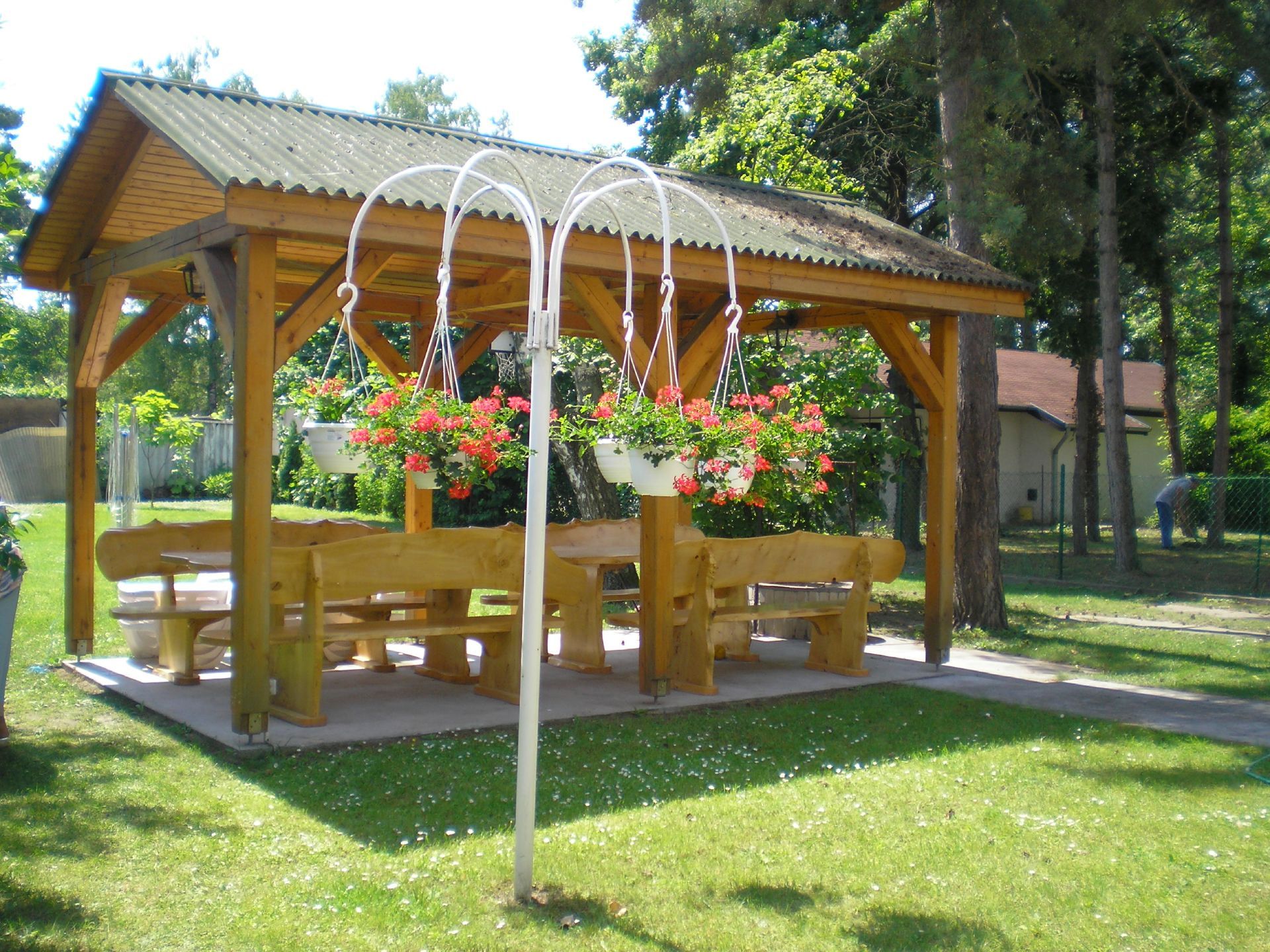 - fedett kerti fa bútor, étkezésre alkalmas kialakítással, szabadban kialakított faszenes roston sütési lehetőség az udvarban